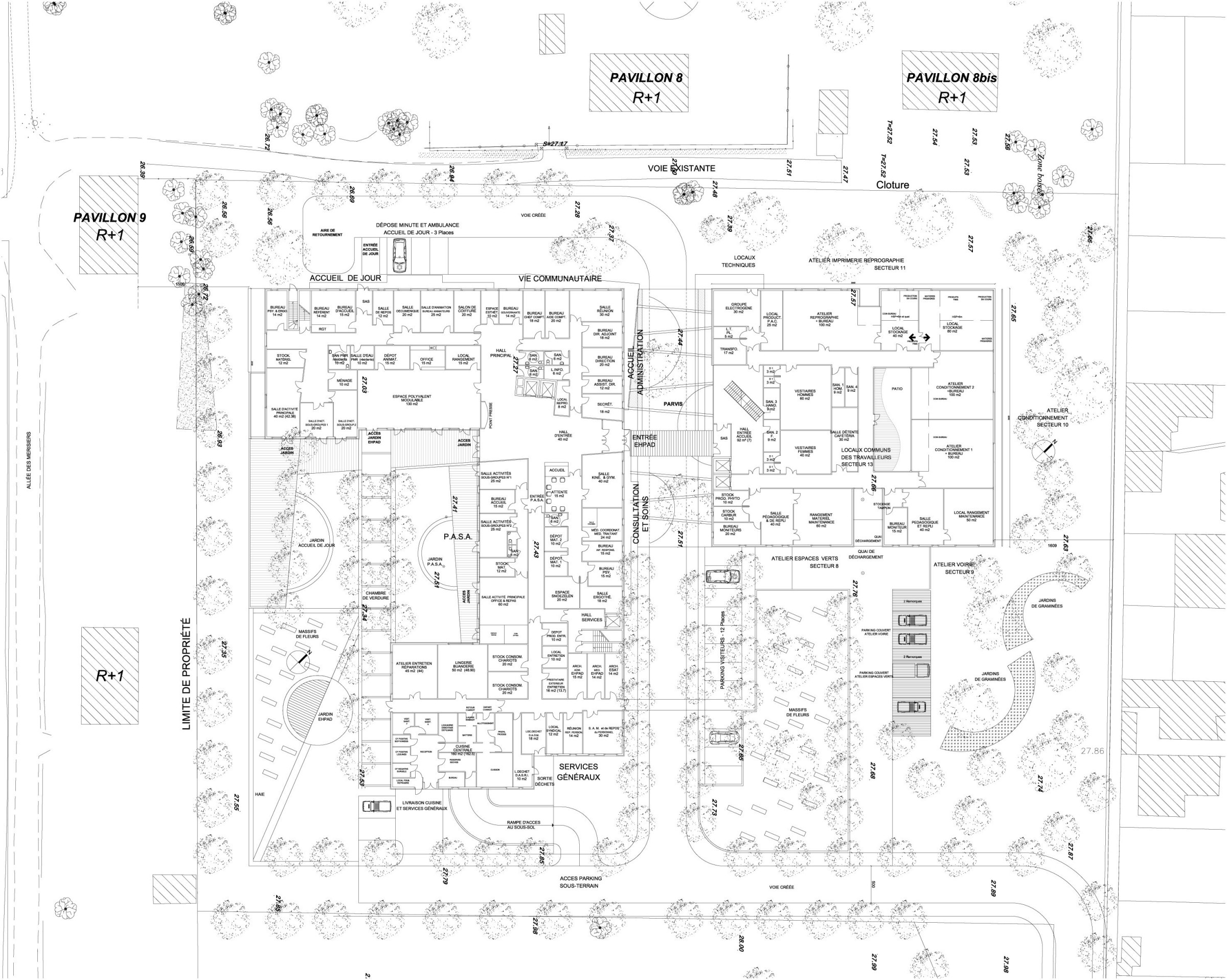 - EHPAD (Etablissement d’Hébergement pour Personnes Agées Dépendantes), pour le bâtiment principal sur un plan en équerre.